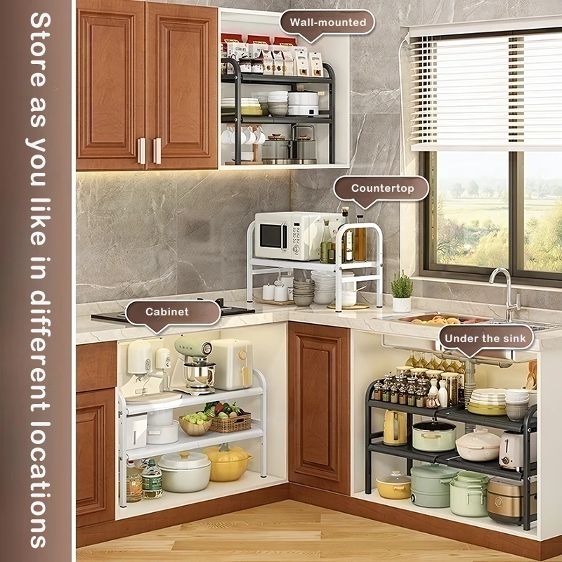 Under Sink Expandable Storage Rack - Adjustable Multi-Tier Cabinet Organizer (Black / White)